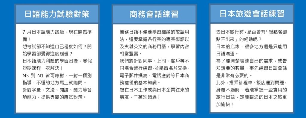 無論您是為了在工作上使用日語、冬季前往日本旅遊,或是準備參加日本語能力試驗,我們都提供符合您不同目標的日語學習課程。