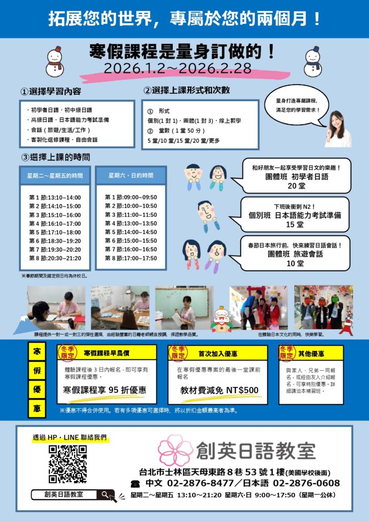 即使是大學生或工作繁忙人士,也能彈性選擇上課時間和次數,輕鬆學習。我們也為您準備了利用寒假的體驗課程。